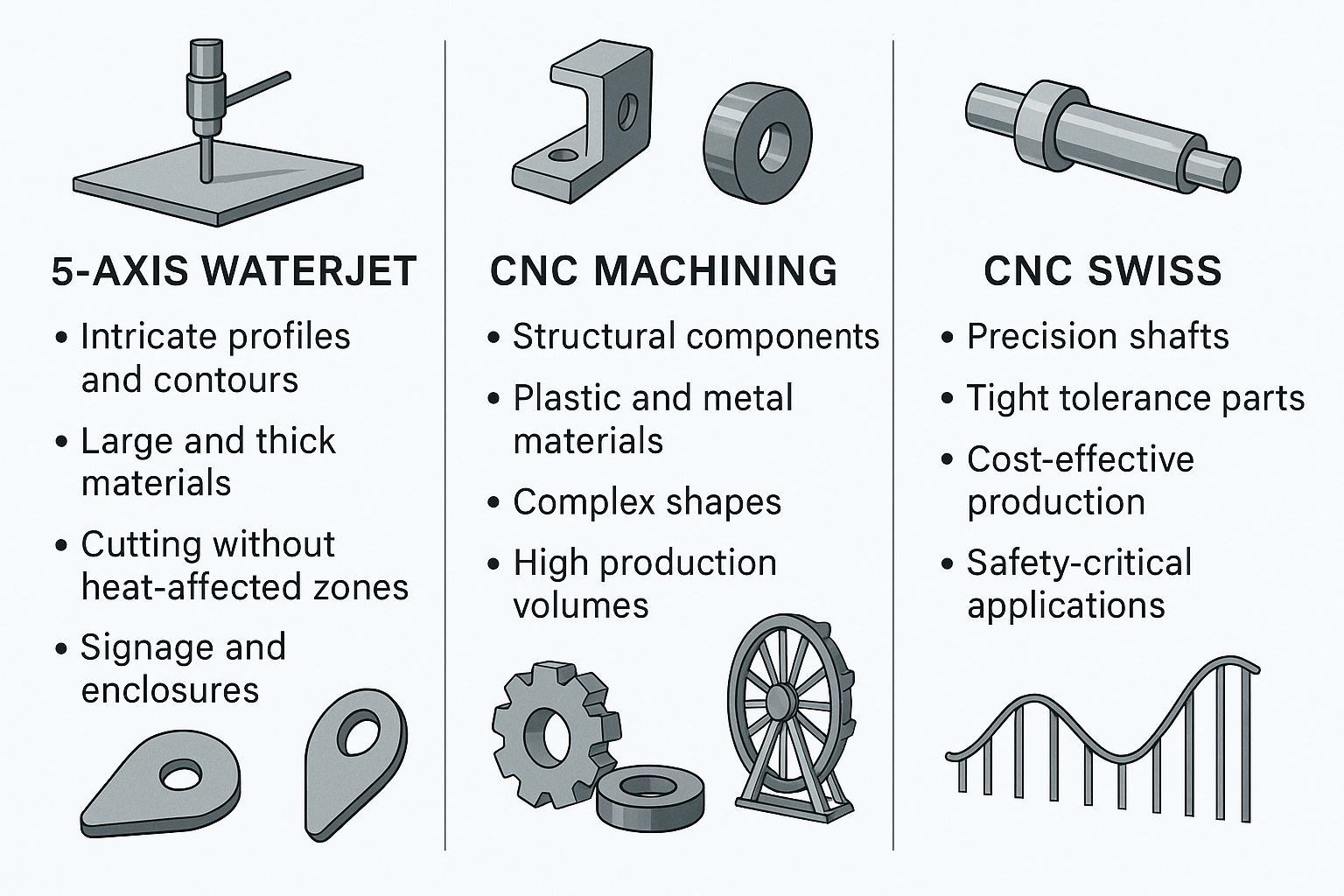 Amusement rides demand the highest levels of structural integrity, durability, and safety — and that starts at the component level. At Mainstream, we leverage our deep expertise in 5-axis waterjet cutting, CNC machining, and CNC Swiss machining to deliver complex parts that meet the rigorous demands of the amusement ride sector.